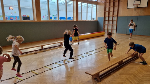 Der quirlige Frosch Hopsi Hopper vom ASKÖ-Bewegungsprogramm war wieder zu Besuch und turnte mit allen Klassen im Turnsaal.